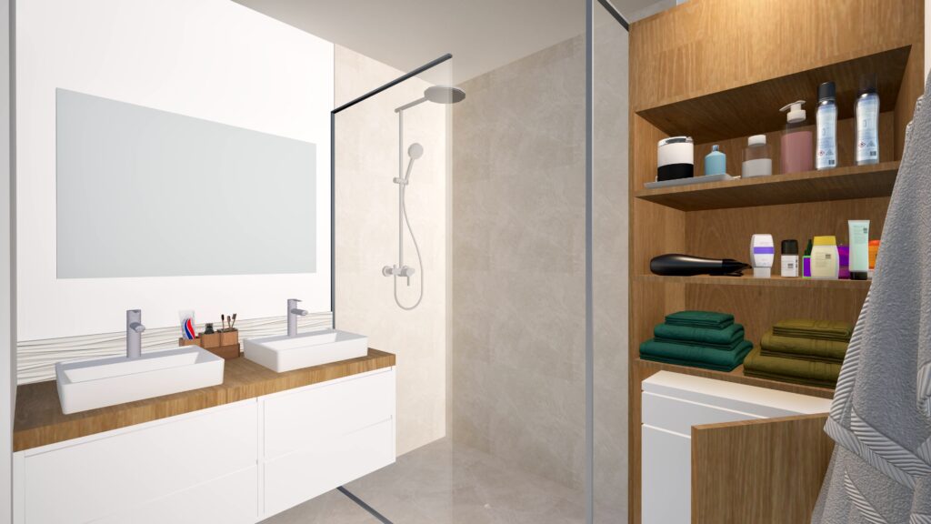 Découvrez les visuels d’un futur projet de rénovation de salle de bain, avec des rangements sur mesure créés pour maximiser l’espace et le confort